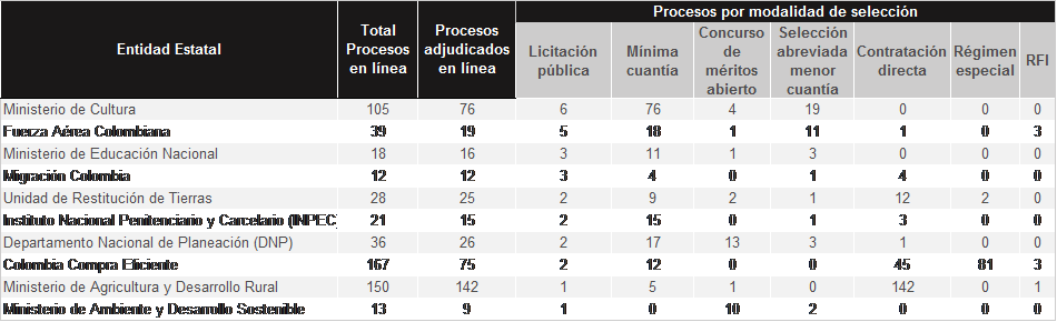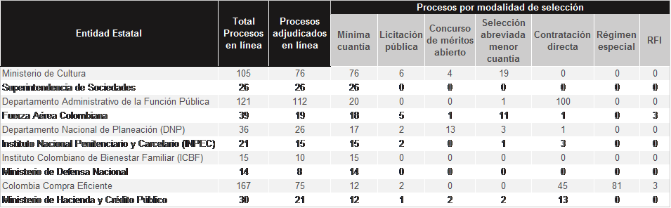 A la fecha hay 483 Entidades Estatales registradas en el SECOP II, 134 Entidades son del nivel nacional y 349 del nivel territorial. Entre las diez Entidades de la rama ejecutiva del orden nacional que más procesos de licitación pública realizan en tiempo real en el SECOP II están: (i) el Ministerio de Cultura; (ii) la Fuerza Aérea Colombiana; (iii) Migración Colombia; (iv) Unidad de Restitución de Tierras; (v) el Instituto Nacional Penitenciario y Carcelario -INPEC-; (vi) el Departamento Nacional de Planeación -DNP-; (vii) la Unidad de Restitución de Tierras; (viii) Colombia Compra Eficiente; (ix) el Ministerio de Agricultura y Desarrollo Rural; y (x) el Ministerio de Ambiente y Desarrollo Sostenible. (Conozca el detalle en la Tabla 1)